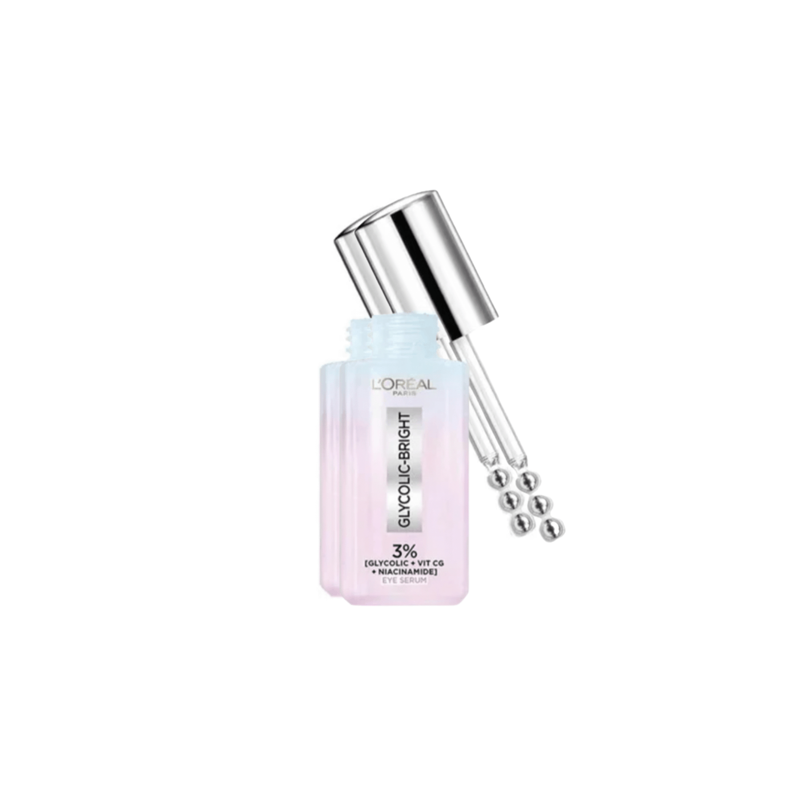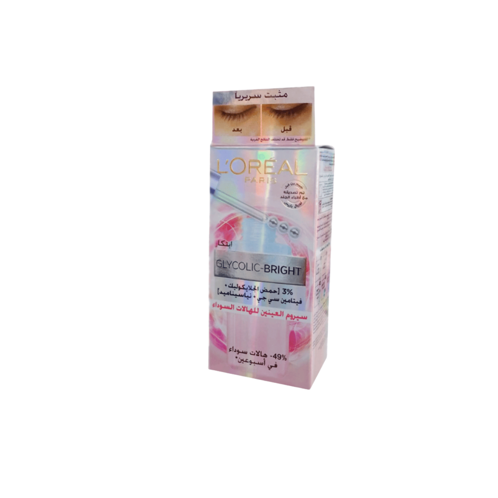 سيروم العينين من لوريال باريس بتقنية Glycolic Bright هو حل متقدم لتقليل الهالات السوداء وتفتيح منطقة حول العين. يجمع بين 3% حمض الجلايكوليك الذي يساهم في تجديد البشرة، وفيتامين Cg المعروف بتفتيح البشرة وتعزيز الإشراقة، إضافة إلى النياسيناميد الذي يعمل على تهدئة البشرة وتقليل التصبغات.